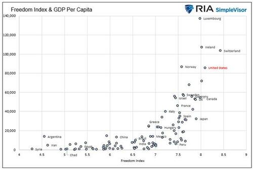 Quantifying The Benefits Of Capitalism Authored by Michael Lebowitz via RealInvestmentAdvice.com, The graph below presents another opportunity to revisit how capitalism and the economic freedom it entails lead to prosperity. The scatter plot below shows the intersection of The Fraser Institute’s Economic Freedom Index with per capita GDP for 102 of the largest economies. Before analyzing the graph and what it implies for […]